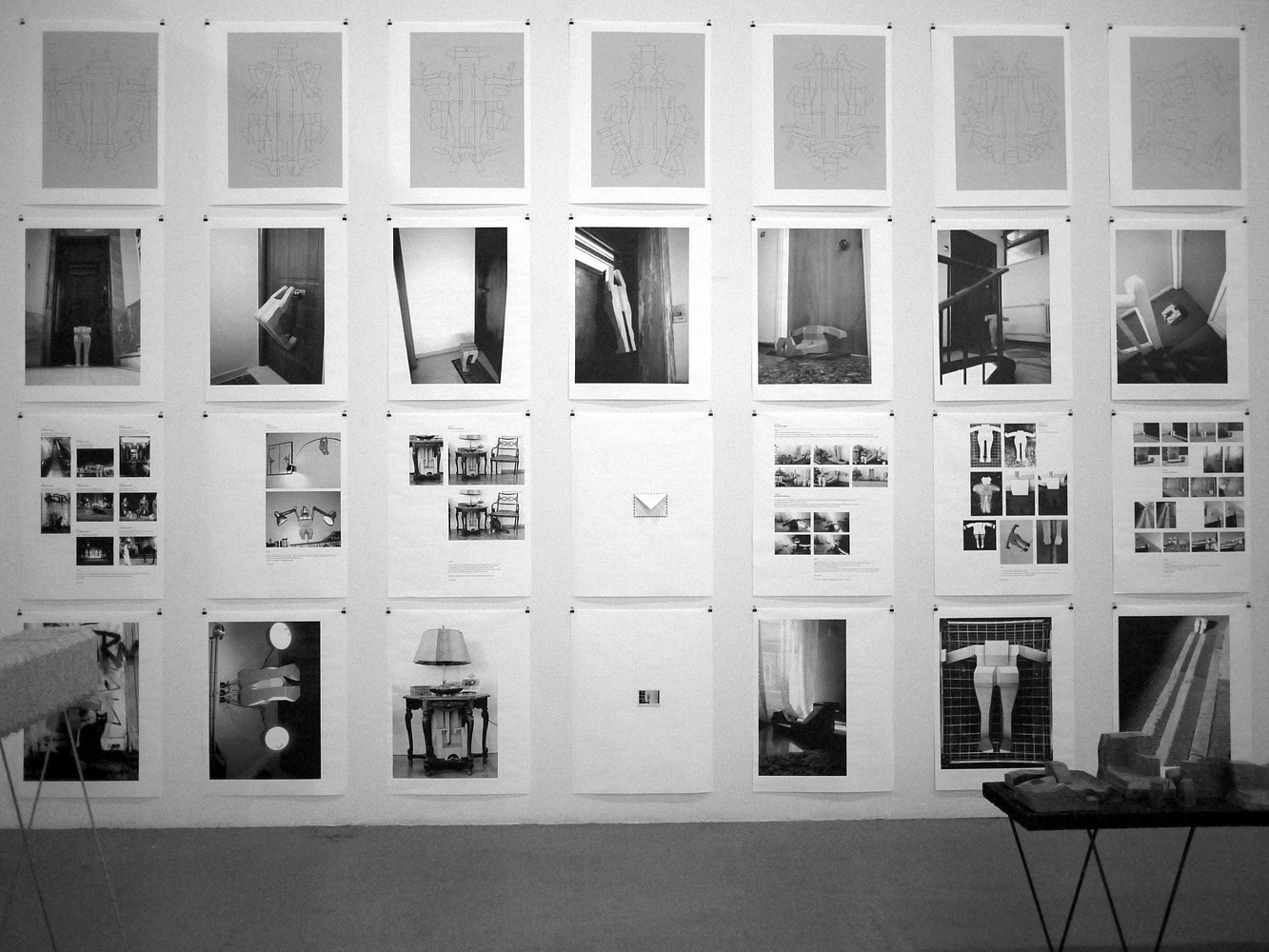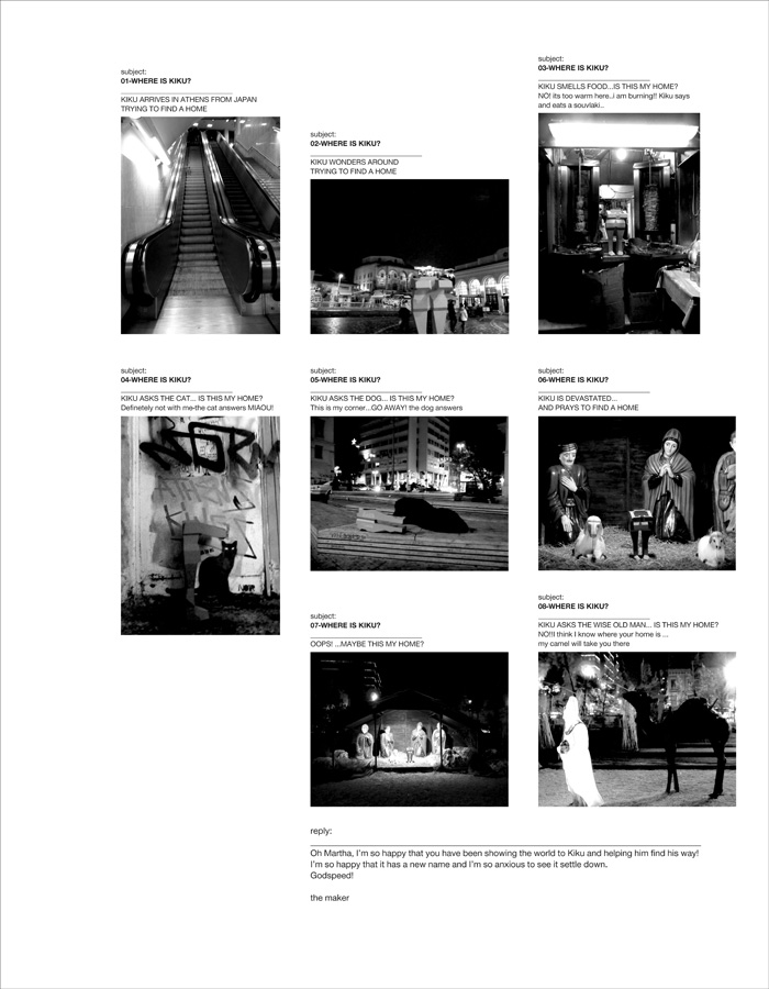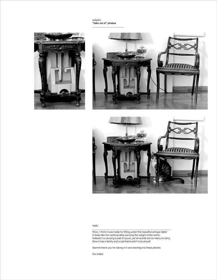 The completed work is constituted by photos outside these doors, photos that were sent through email, dialogs among the new parents and the maker and blue prints for making the box figures.